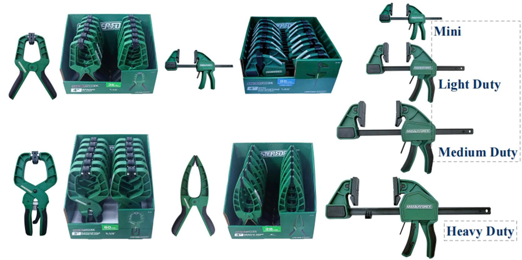 C clamps, F clamps, plastic quick clamps, pipe clamps, corner clamps, spring clamps, sash clamps, pipe bender, snips