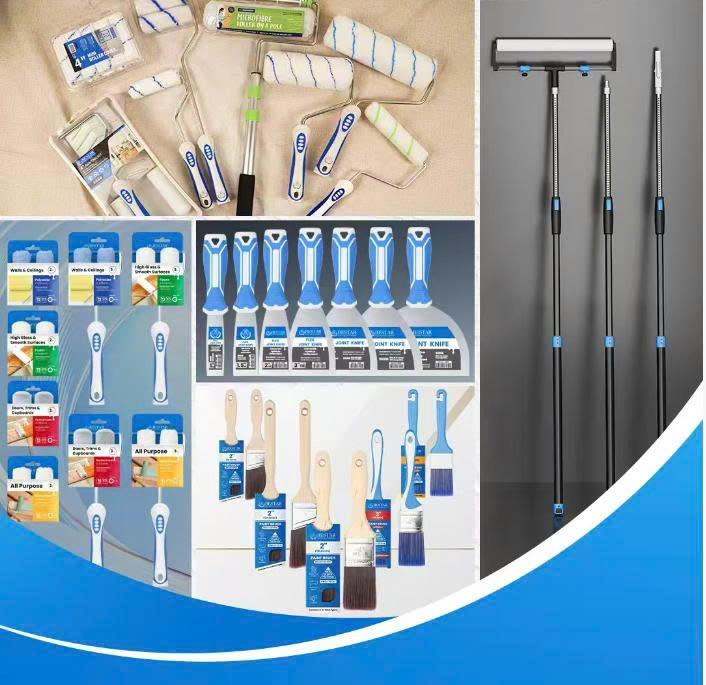 Cọ vẽ, con lăn sơn, khung lăn sơn, con lăn mini, bộ dụng cụ sơn, khay và xô, lót khay, cán nối dài, dụng cụ chuyên dụng và các phụ kiện sơn. Dụng cụ vệ sinh, cây lau nhà, dụng cụ vệ sinh con lăn
